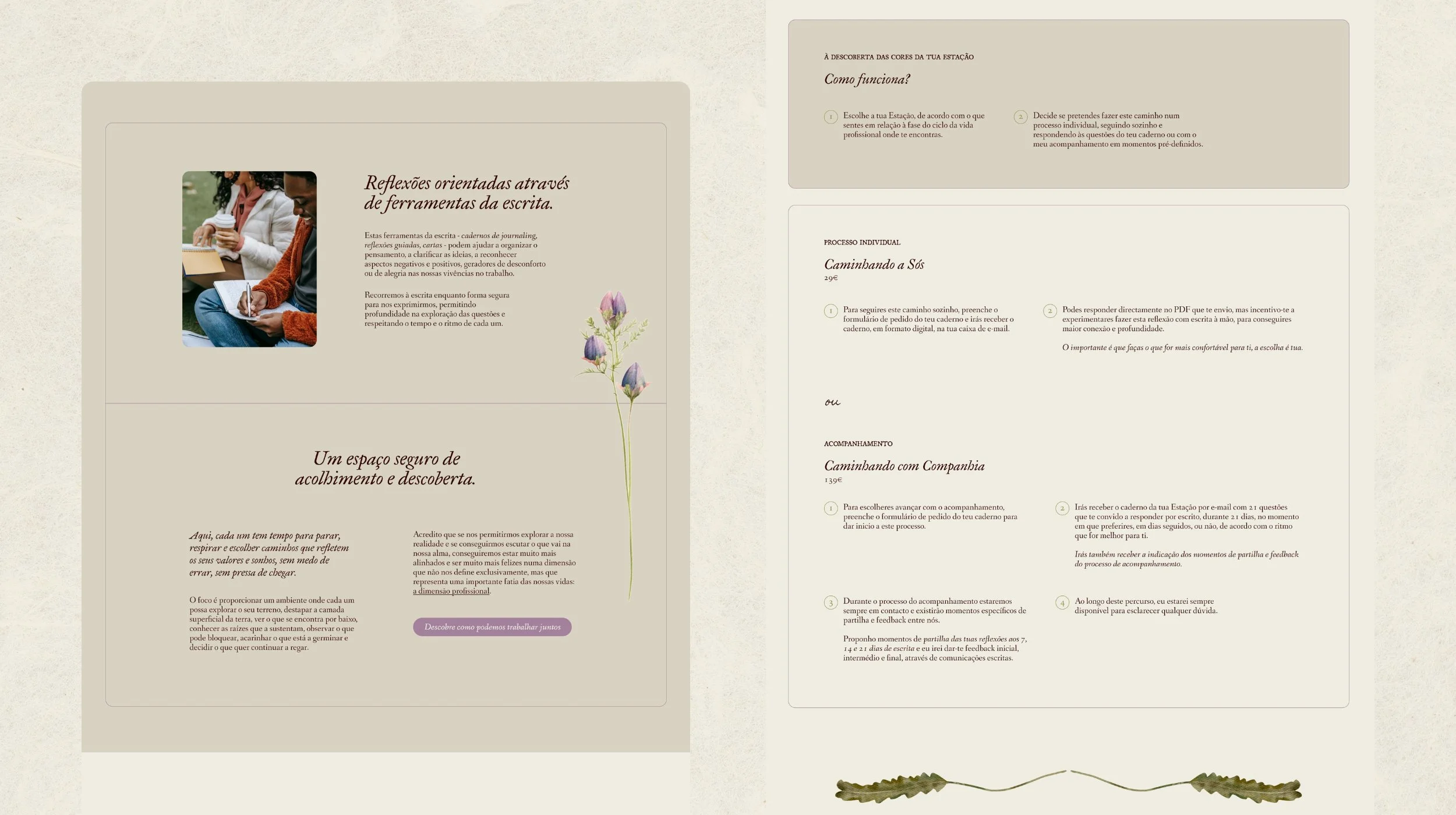 When we started working together, Filipa was at the very beginning. The vision was there, but the structure wasn’t. Her offers were still forming. The language was still soft around the edges. Through strategy, everything aligned — the positioning, the seasonal structure of her services, and the emotional space her brand would hold.